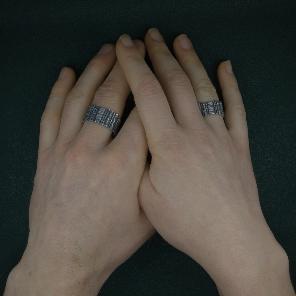 Une rangée de livres, comme alignés sur une étagère de bibliothèque, constitue cet anneau. Ce bijou est de fabrication artisanale Française, en argent 925‰.