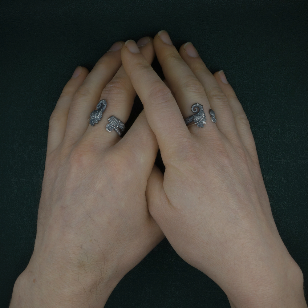 Cette bague représente un fossile d'ammonite déroulée, accolée à feuille et une crosse de fougère, qui vient s'enlacer autour du doigt. L'ammonite avec sa forme spiralée caractéristique, est un emblème des cabinets de curiosités, et sa présence incontournable dans toute collection de fossile qui se respecte.