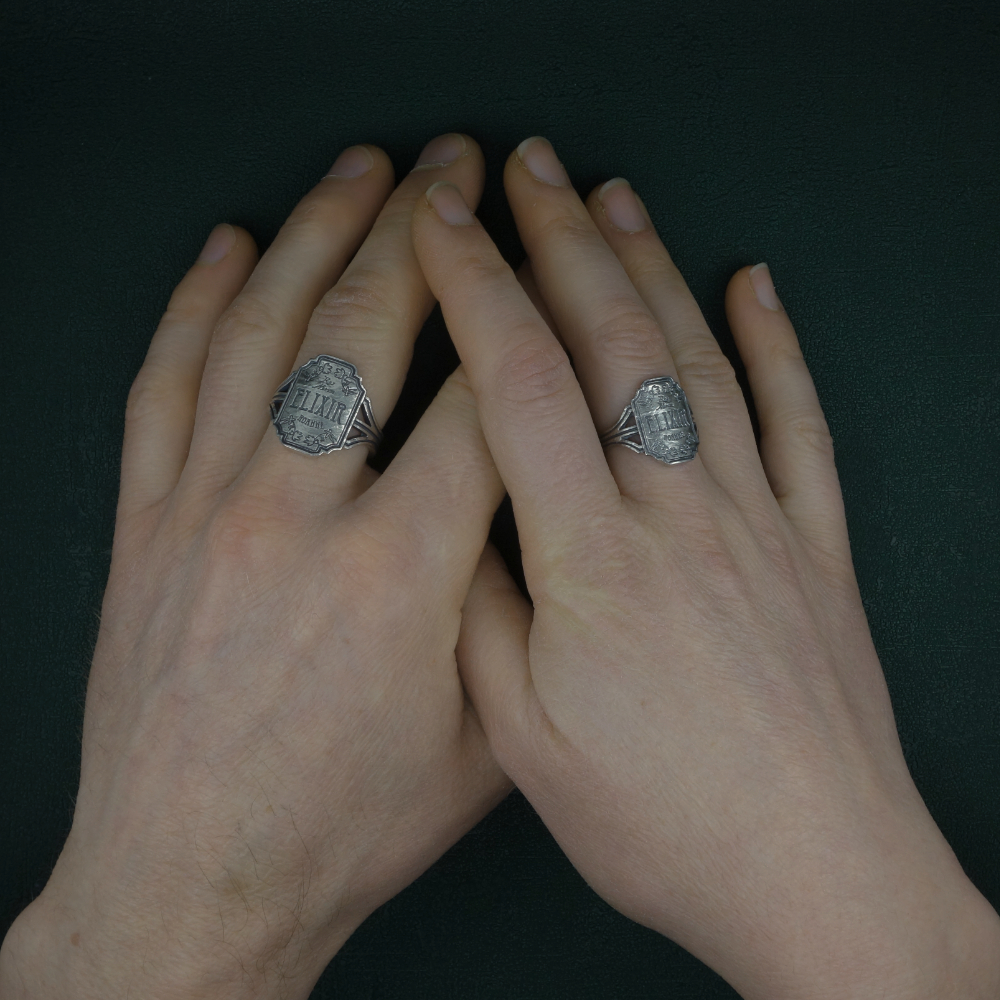Bague en argent s’inspirant d’une étiquette de fiole d’apothicaire, esprit sorcellerie, magie… Ce bijou est de fabrication artisanale Française, en argent 925‰.