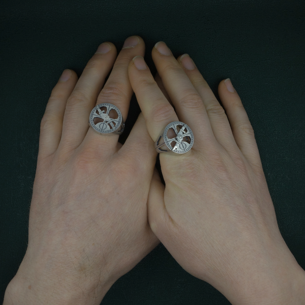 C’est de cette version nautique de l’astrolabe dont cette bague s’inspire. Elle en reprend les formes épurées, l’aspect massif et ajouré. L’aiguille (appelée alidade) sur le dessus pivote. Le résultat est une chevalière originale et robuste, avec une vraie touche steampunk !