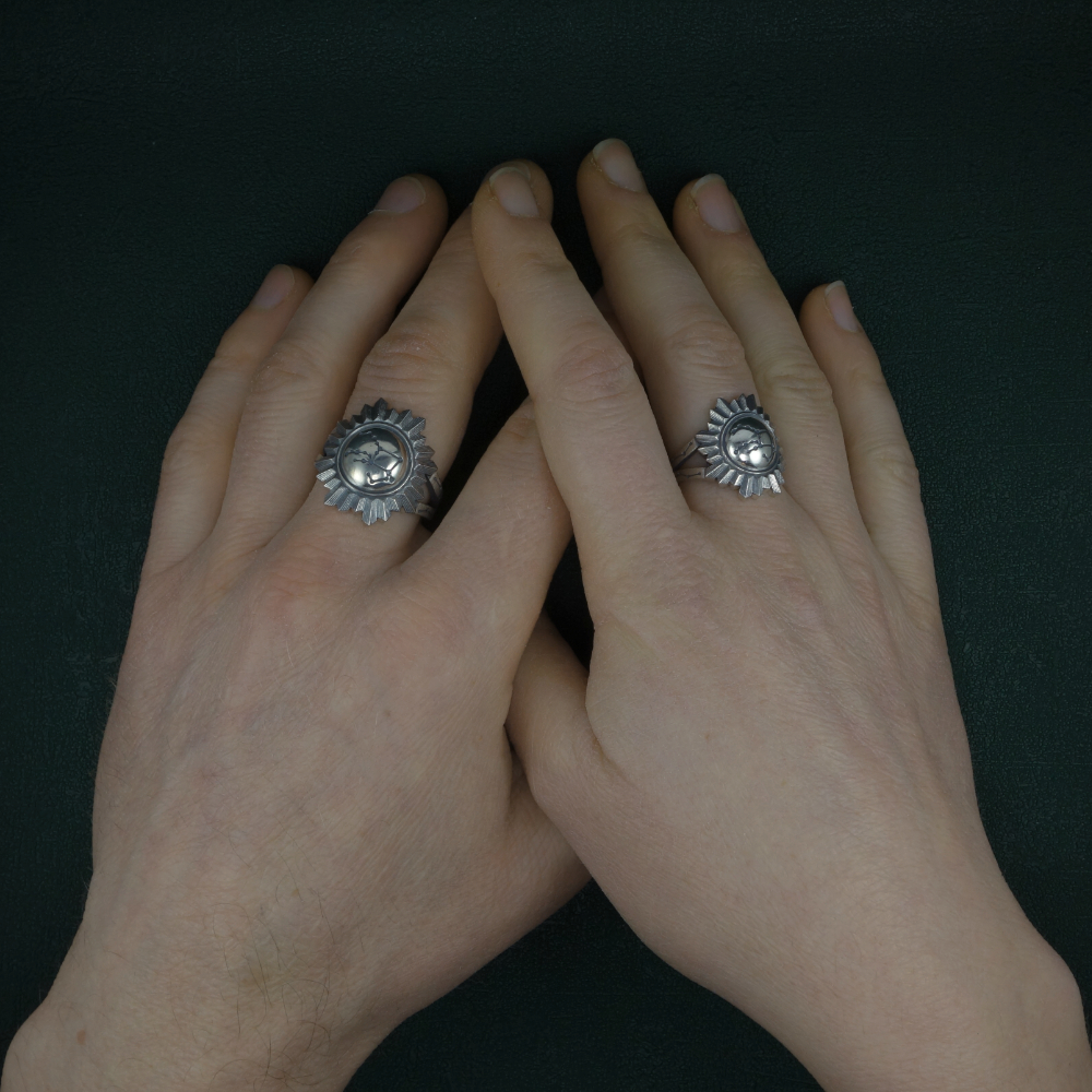 Cette bague reprend la forme très caractéristique d'un miroir soleil, facilement reconnaissable à son verre rond et convexe. Pour ses propriétés optiques singulières, cet objet de curiosité était prisé des talentueux peintres flamands du XVe siècle, qui l'intégraient volontiers dans leurs tableaux. Il aurait été utilisé à cette époque pour surveiller une pièce, grâce à sa capacité à refléter l'environnement tout autour, en particulier par les banquiers - lui valant alors l'appellation de miroir de banquier. Puis accroché aux murs des intérieurs bourgeois, son aspect mystérieux lui aurait valu le surnom de miroir de sorcière ou œil de sorcière. On vient ensuite l'utiliser en objet décoratif pour sa capacité à apporter le soleil dans une pièce. Il se décline alors entouré de rayons, rappelant la forme stylisée de notre astre solaire, et prend le nom de miroir soleil.