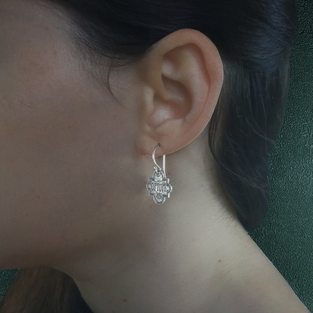 Ces boucles d’oreilles s’inspirent des étiquettes des anciennes fioles d’apothicaires. Ce bijou est de fabrication artisanale Française, en argent 925‰.