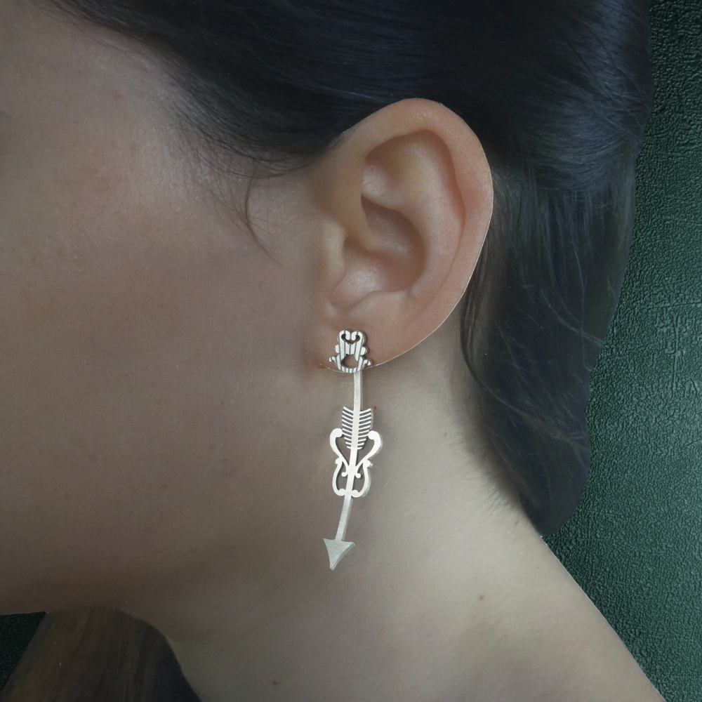 Ces boucles d'oreilles en forme de flèches, ont une double symbolique. "Sagitta" en latin, la flèche évoque tout d'abord la constellation et le signe du zodiaque du Sagittaire ; mais on peut également y voir une aiguille, présente sur beaucoup d’instruments de mesure et outils astronomiques anciens ! Cette flèche rappelle ici tout particulièrement la sphère armillaire…