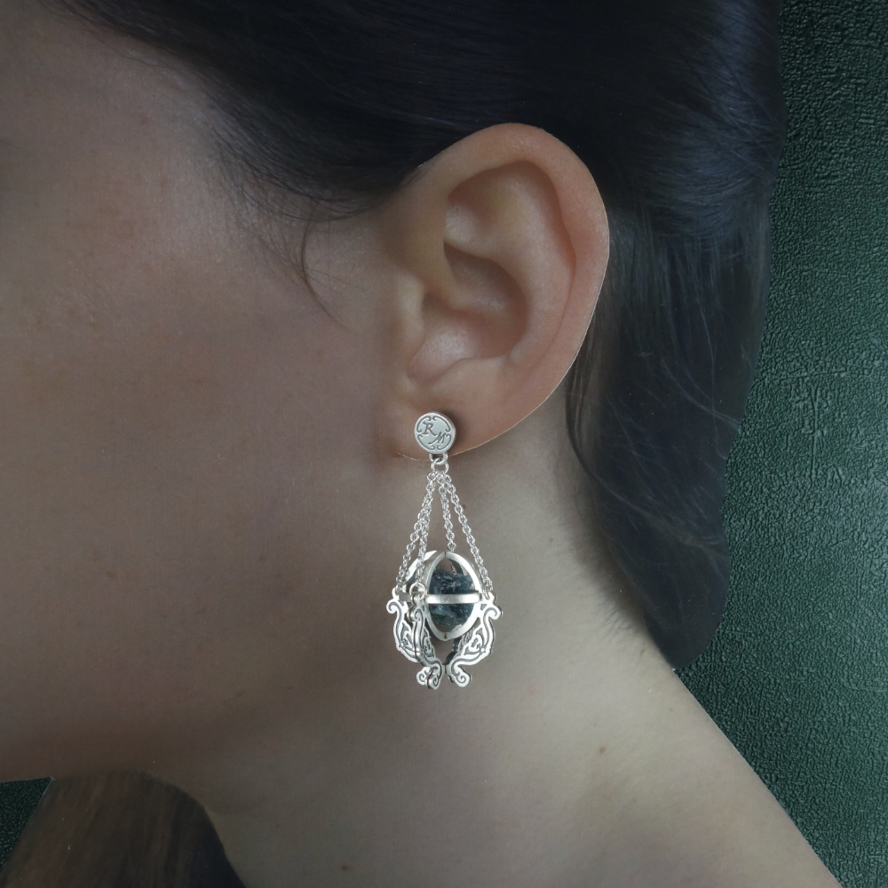 Ces boucles d'oreilles sont asymétriques. L'une reprend la forme des magnifiques globes terrestres anciens sur pieds, instrument apparu à la Renaissance, symbole de connaissance en astronomie et géographie… cette boucle forme une cage à l'intérieur de laquelle est emprisonnée une pierre brute d'apatite, aux reflets gris-bleu. Cette cage est suspendue par quatre chaînettes à une puce gravée des initiales RM. La pierre est taillée par nos soins à partir d'un bloc, pour lui conférer un aspect minéral ; à noter, la forme et la couleur de la pierre varient d'un bijou à l'autre, et ne sont donc jamais exactement identiques à l'image.
