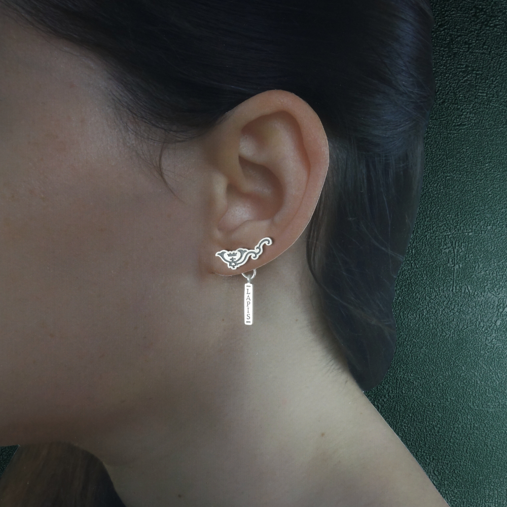 L'autre boucle reprend un motif d'ornementation tel que l'on pouvait en voir sur les vitrines des collectionneurs de pierres ; elle se porte à l'oreille gauche, car elle est conçue pour venir remonter le long de l'oreille. Sous ce motif est suspendue une petite étiquette gravée "Lapis" au recto et "Mirum" au verso (qui signifie pierre étrange en latin).