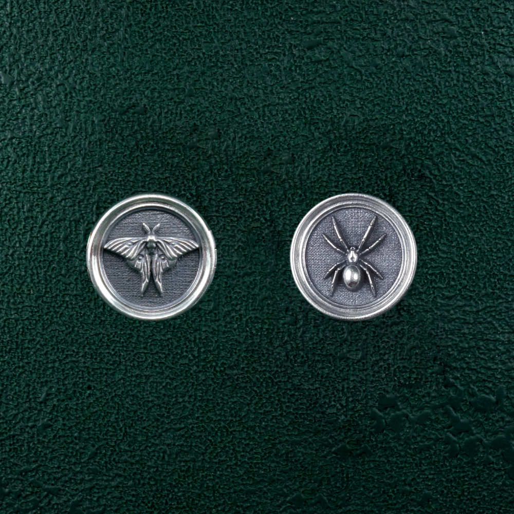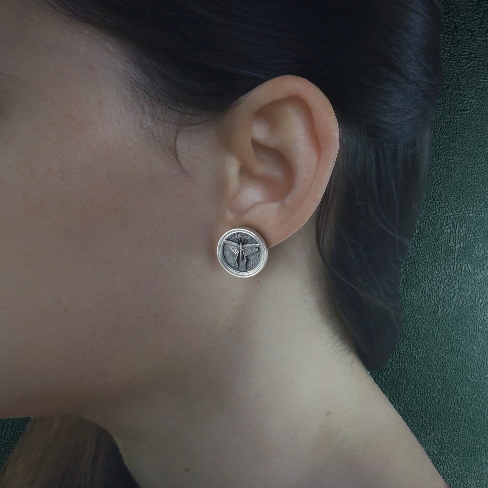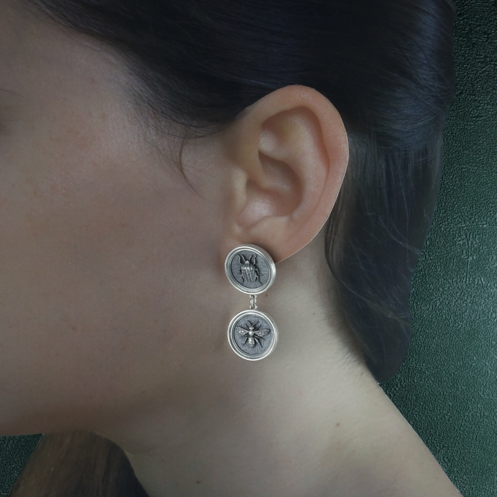 Ces boucles reprรฉsentent des insectes, ร la maniรจre des cadres entomologiques. Ce bijou est de fabrication artisanale Franรงaise, en argent 925โฐ.