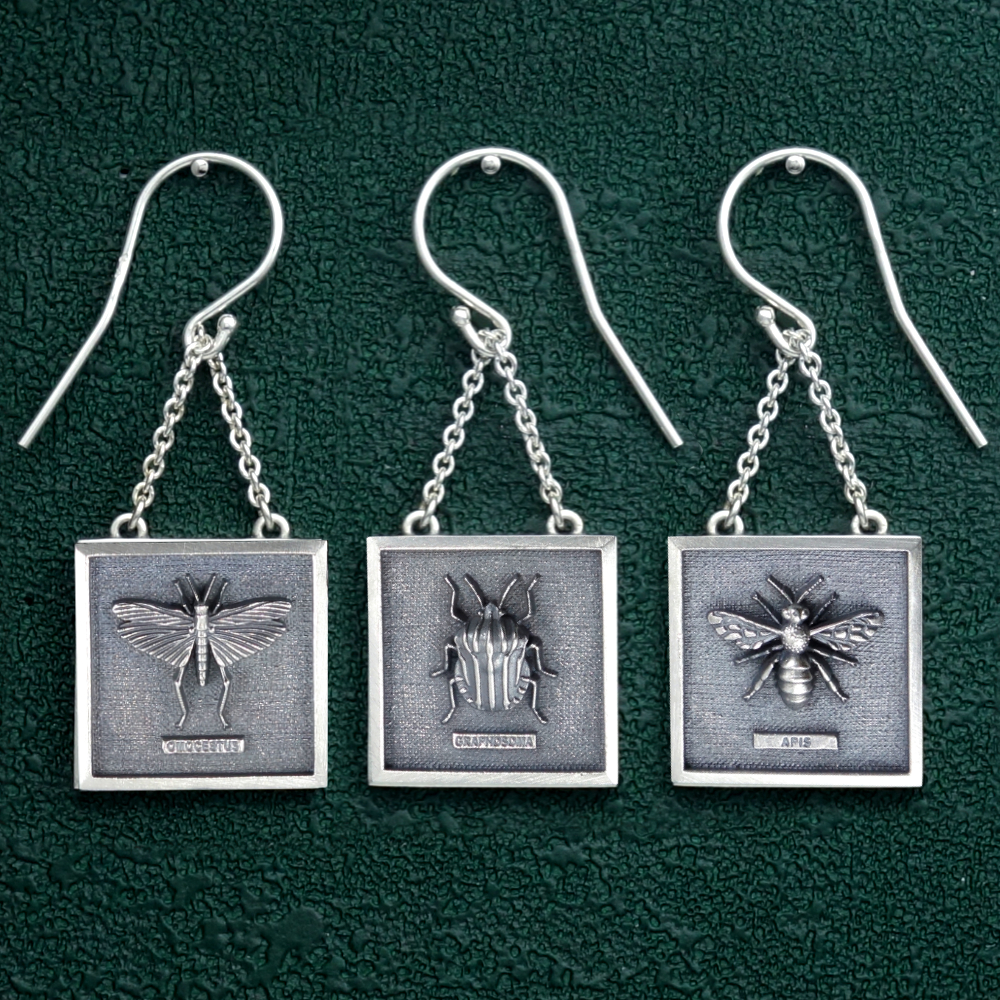 Ces boucles d'oreilles sont issues de la ligne Entomologie, qui décline des insectes à la manière des cadres entomologiques anciens.