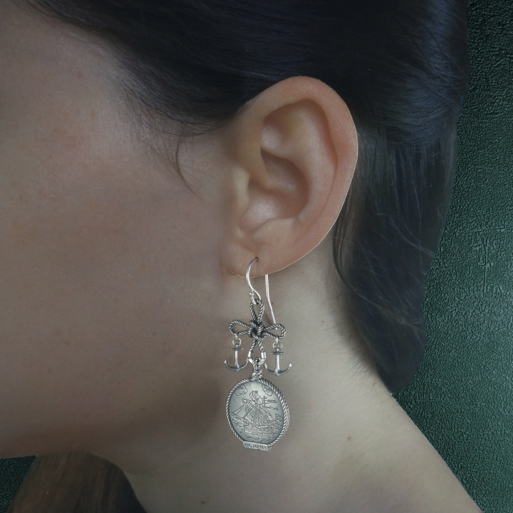 Ces boucles d’oreilles sont constituées de cordes nouées en croix du marin, et représentent la caraque de Magellan et un bateau Viking. Argent 925.