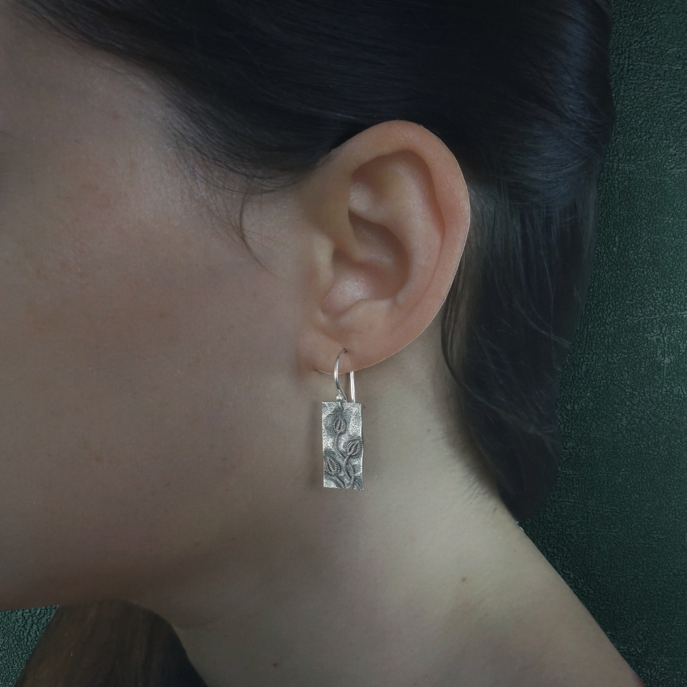 Ces boucles d’oreilles représentent des fossiles de lys de mer coupés net en rectangle. Ce bijou est de fabrication artisanale Française, en argent 925‰.
