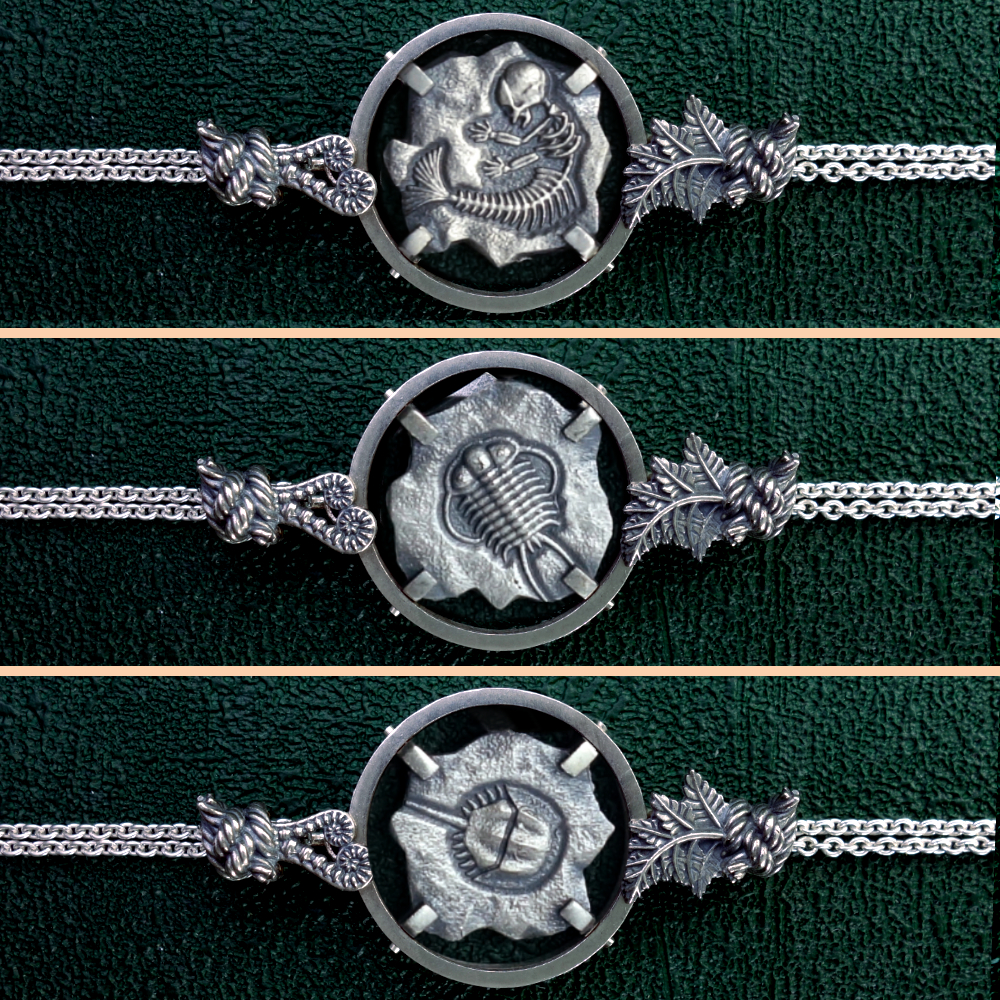 Sur demande, ce fossile de Chimère peut être remplacé au choix par les trois autres motifs créés dans cette ligne : la sirène, le trilobite et la limule. visibles sur la sixième photo.