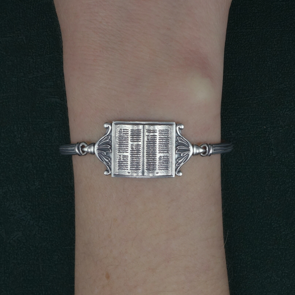 Ce bracelet reprรฉsente un livre ancien manuscrit posรฉ sur un lutrin. Ce bijou est de fabrication artisanale Franรงaise, en argent 925โฐ.
