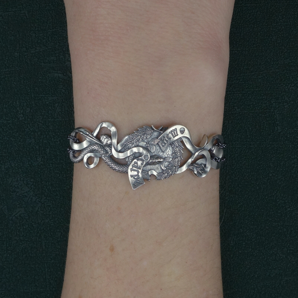 Bracelet gravรฉ Carpe diem รฉvoquant une vanitรฉ, tel un memento mori. Influences baroques, pour homme ou femme. Bijou fait en France, en argent 925โฐ noirci.
