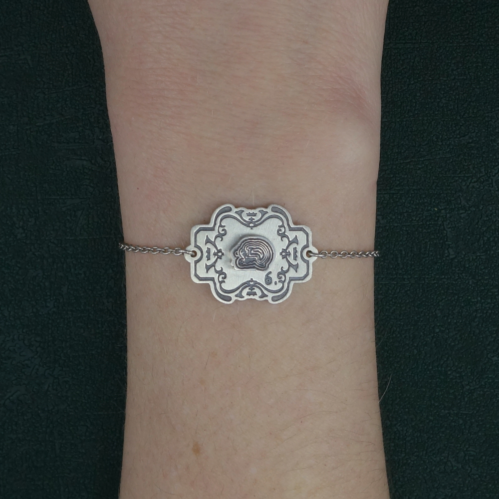 Ce bracelet de style rétro est conçu comme une planche de dessin illustrant une malachite. Ce bijou est de fabrication artisanale Française, en argent 925‰.