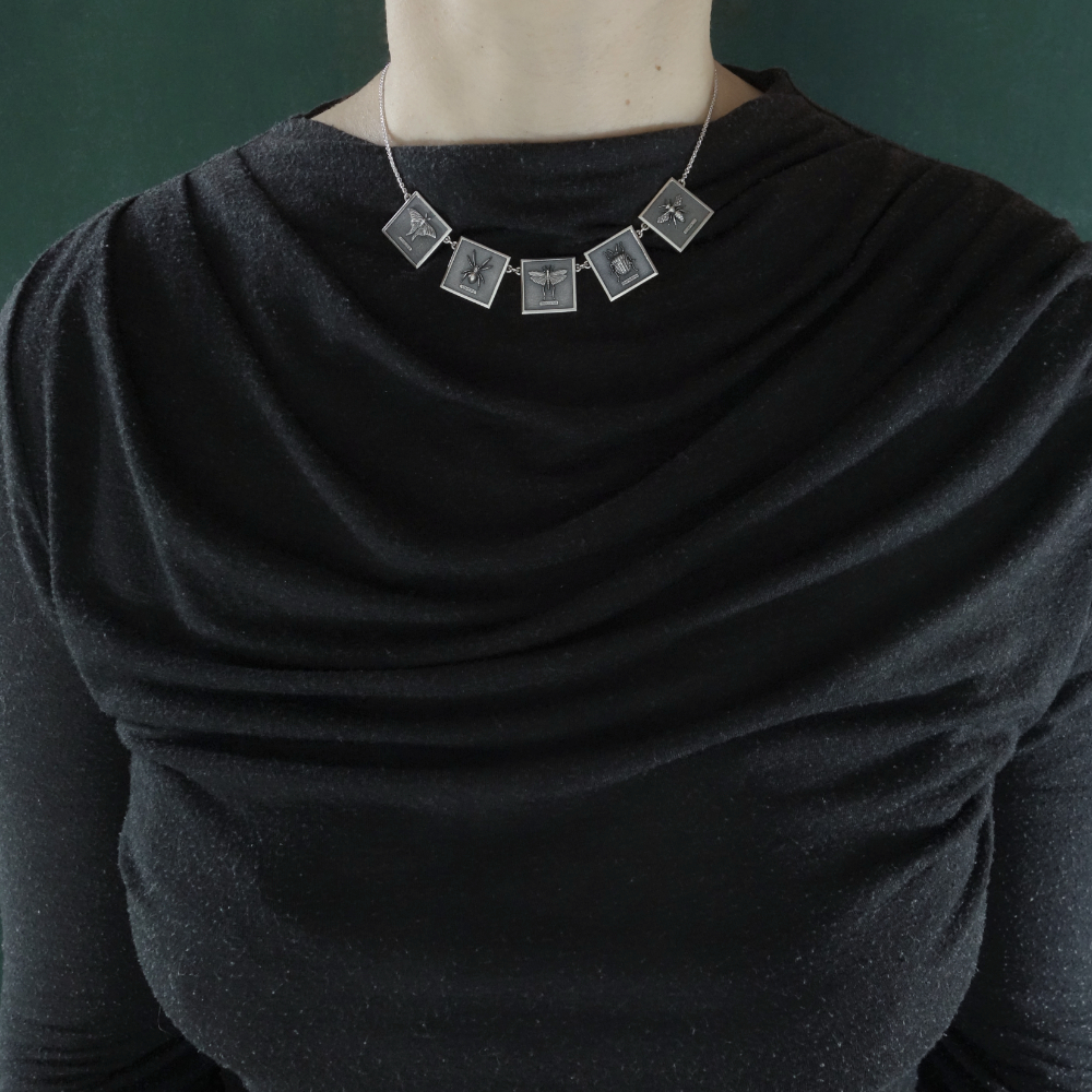 Collier composé de 5 cadres à insectes typiques des cadres d’entomologie. Ce bijou est de fabrication artisanale Française, en argent 925‰.