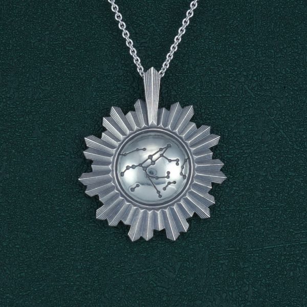 Le centre de ce pendentif solaire en argent 925 est donc poli comme un miroir ; au centre de ce miroir est gravée la fameuse constellation de la Grande Ourse.