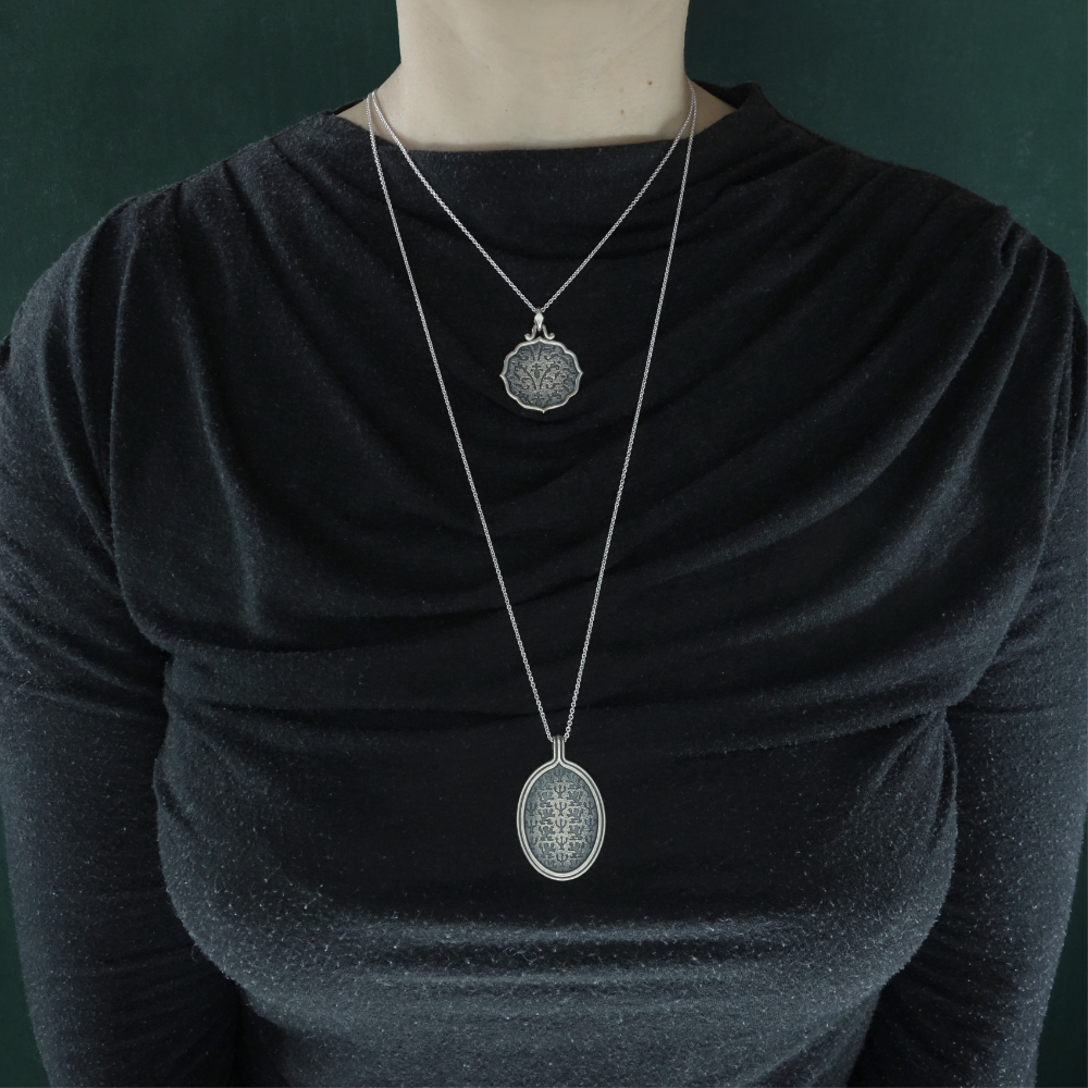 Finition : Nous donnons à l’argent un aspect patiné ancien pour conférer aux bijoux un cachet antique, et faire ressortir les détails des motifs et les gravures.